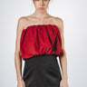 Miniabito in duchesse con corpetto increspato.